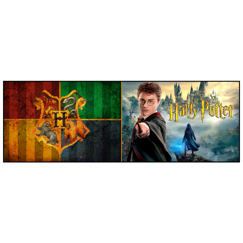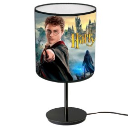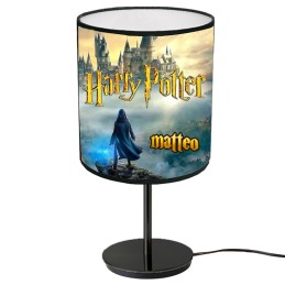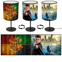 Jolie lampe de chevet imprimée avec Harry Potter sur fond de château de Poudlard et les 4 maisons de l'autre côté.