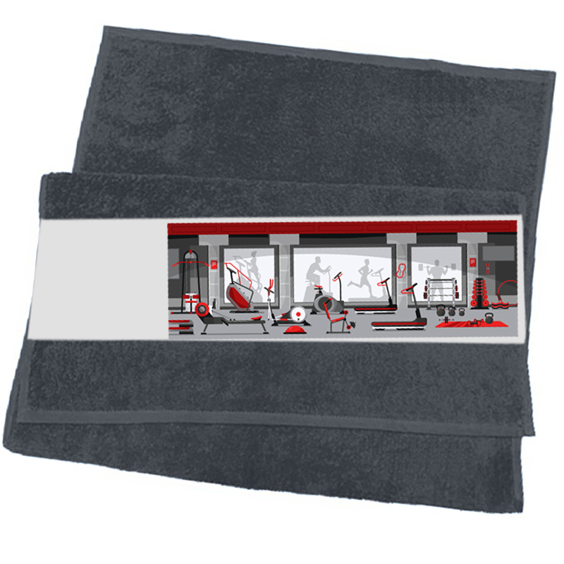 Serviette en éponge 100% coton 400gr de couleur graphite et un bandeau blanc en polyester personnalisable en ligne avec un prénom ou texte
