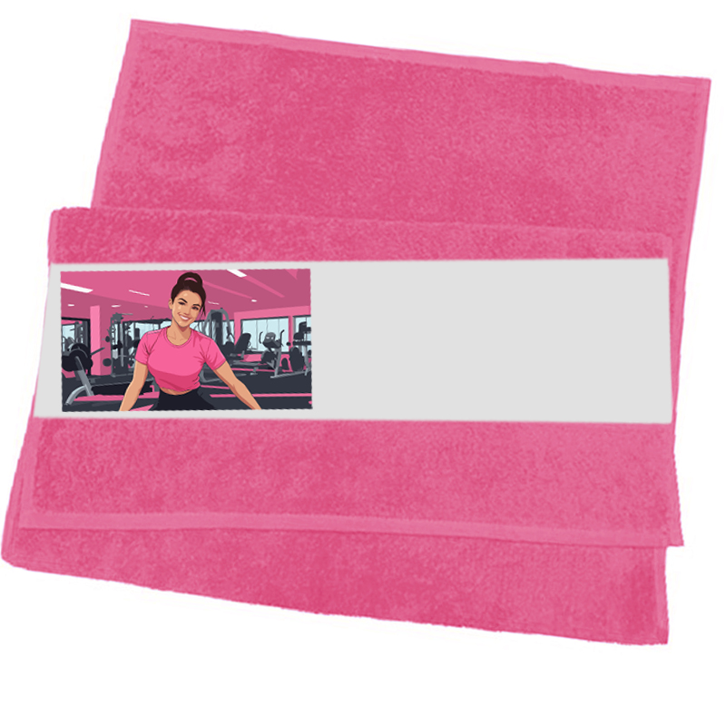 Serviette en éponge de couleur rose avec un bandeau blanc polyester personnalisable