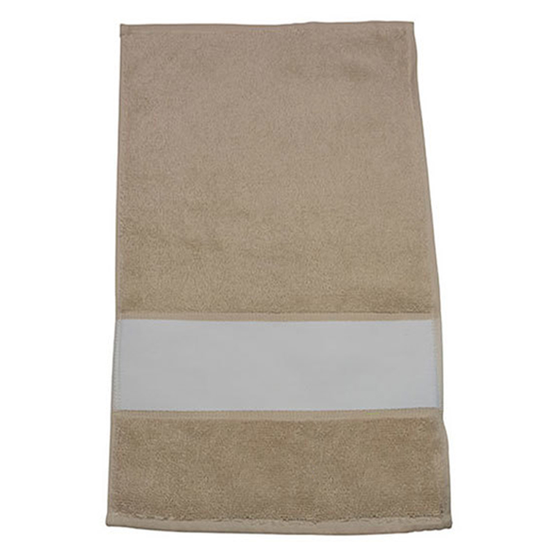Serviette éponge 100% coton de couleur sable avec un bandeau blanc en polyester à personnaliser
